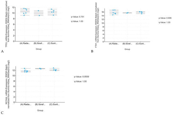 A validation study of the impact of conventional therapies on the expression of ferroptosis-related genes in KIRP and KIRC: The combined p- and q-values suggest that there is no statistically significant effect of KIRP and KIRC treatment therapies on the mRNA expression of TP53, NCOA4, and FTH1. The high q-values, in particular, suggest that any observed changes in gene expression could be due to random variation rather than any meaningful biological effect. Thus, we conclude that these therapies do not significantly alter the mRNA expression of these genes in both KIRP and KIRC. In (A–C), the abbreviations are defined as follows: Radia denotes Radiation Therapy, Soraf corresponds to Sorafenib, and Sunit indicates Sunitinib.