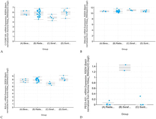 A more detailed analysis of each individual gene revealed that BOLA1 had the highest significant response to radiation therapy, bevacizumab, sorafenib, and sunitinib treatments in KIRC (Figure 4C), and in contrast, PEG3-AS1 showed the highest significant response to radiation therapy, sorafenib, and sunitinib, respectively (Figure 4D).
