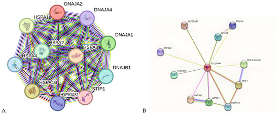Using STRING bioinformatics software, we conducted a protein–protein interaction (PPI) network analysis, identifying 34 key genes associated with KIRC and KIRP (Figure 5). The visual representation of this network shows gene relationships, where circles represent genes and lines indicate interactions between them. To further classify these genes, K-means clustering was applied. When analyzing DNAJA2-associated genes, three distinct gene clusters were identified (Figure 5A). Similarly, the PPI network analysis of SLC25A44, combined with K-means clustering, revealed seven gene clusters linked to KIRC and KIRP (Figure 5B). Each cluster was named according to its grouped genes. Additionally, PPI analysis of PHLPP2 identified 11 related genes, which were further divided into three clusters (Figure 5C). Figure 5D illustrates the overlap of genes linked to both DNJA2 and PHLPP2, while also highlighting the absence of shared genes between DNJA2 or PHLPP2 and SLC25A44. This observation suggests the need for further investigation. These findings help categorize genes based on molecular similarities and their potential roles in KIRC and KIRP.