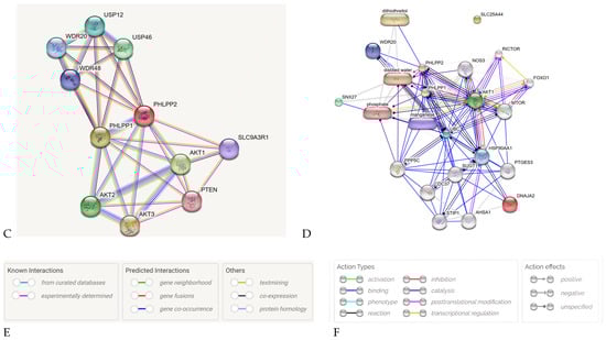 Differentially expressed gene (DEG) protein–protein interaction (PPI) analysis. The STRING Bioinformatics software identified 34 hub genes related to KIRC and KIRP, visually represented through figures showing gene relationships with lines and circles. K-means clustering grouped DNAJA2-associated genes into three distinct clusters (A), while SLC25A44 analysis revealed seven clusters of genes named after their contents (B). The PHLPP2 analysis unveiled 11 KIRP and KIRC genes divided into three clusters based on protein–protein interactions (C). Figure (D) depicts the intersection study of DNJA2, SLC25A44 and PHLPP2. (E) Represents the legend for Figures (A–C). (F) Represents the legend for Figure (D).
