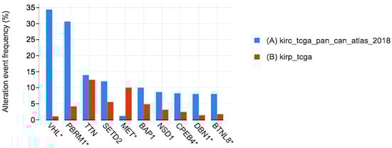 This TCGA dataset provides valuable insights into the genes with the highest mutation frequencies that exhibit statistically significant differences between KIRC and KIRP (p < 0.05). These findings highlight crucial genetic alterations that could play a fundamental role in the initiation, development, and progression of these cancers. By identifying these key mutations, these data contribute to a deeper understanding of the molecular mechanisms underlying KIRC and KIRP, potentially aiding in the development of targeted therapeutic strategies and improved diagnostic approaches. It is evident from the data that genes such as VHL, TTN, BAP1, PBRM1, and SETD2 are consistently identified as the most frequently mutated genes in KIRC, underscoring their potential importance as key drivers of tumorigenesis in this specific cancer subtype. Similarly, this analysis reveals that MUC16, SETD2, MET, TTN, and KMT2C are among the genes exhibiting the highest frequency of mutations in KIRP, emphasizing the diverse genetic landscape and highlighting potential targets for further research and therapeutic interventions. The asterisks (*) used on VHL, PBRM1, MET, CPEB4, DBN1 and BTNL8 in Figure 6 denote the genes implicated in both KIRC and KIRP pathogenesis as shown by the analysis.