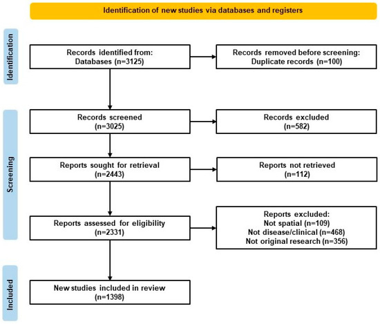 A total of 3125 records were identified through PubMed. After removing 100 duplicates, 3025 titles and abstracts were screened in Rayyan AI. Of these, 582 were excluded for not meeting inclusion criteria during abstract review. The remaining 2443 full texts were sought for retrieval, and 2331 were reviewed, with 933 excluded for reasons such as absence of ST methods or lack of disease relevance. In total, 1398 studies were included in the final synthesis. The selection process is outlined in the PRISMA-ScR Flow Diagram (Figure 1).