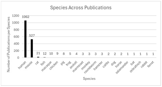 ST has been widely applied across human and animal models, demonstrating versatility for investigating disease mechanisms, cellular architecture, and tissue organization in a variety of biological systems. Among the 1398 studies included in this review, 1062 studies employed human models and 619 employed animal models (Figure 3).
