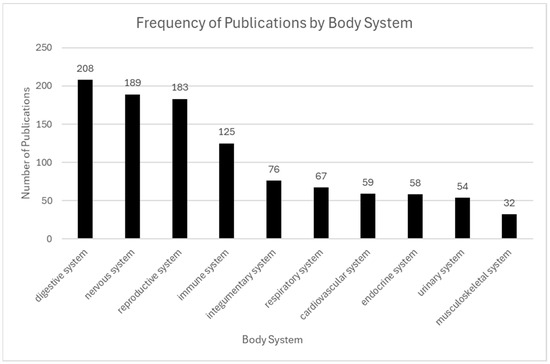 Frequency of publications by body system. The digestive and nervous systems were the most frequently studied, appearing in 208 publications and 189 publications, respectively. The reproductive and immune systems were also prominent, with 183 and 125 publications, respectively. In contrast, systems such as cardiovascular, urinary, integumentary, and musculoskeletal were represented less frequently, each with 60 or fewer publications.