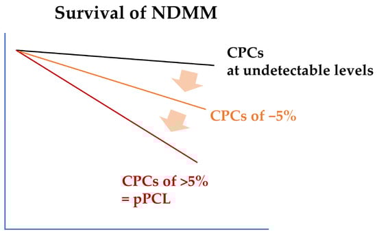 Before the revised diagnostic criteria were updated in 2021 [], the initial diagnostic criteria for pPCL, which were proposed by Kyle et al. in the 1970s, required the presence of ≥20% CPCs with an absolute CPC count of ≥2 × 109/L in the peripheral blood []. In the 2010s, following the development of novel agents for MM, studies reported that patients with a CPC level of 5–19% exhibited poor overall survival (OS) comparable to those observed in patients with ≥20% CPCs [,]. The newly proposed criteria for the diagnosis of pPCL, published by the International Myeloma Working Group in 2021, include a lower percentage of CPCs (≥5%) as a threshold []. Subsequently, several studies have confirmed that the revised diagnostic criteria are appropriate for the diagnosis of pPCL, in terms of prognostic value [,]. However, with more improvements in anti-myeloma treatment, several recent studies have reported that even a CPC level of <5% is an independent poor prognostic factor for NDMM (Figure 1) [,,]. The current diagnostic criterion for pPCL, a cutoff value of 5%, is arbitrary, and recent studies have demonstrated the prognostic value of CPCs as a continuous variable [,]. More suitable or nuanced diagnostic criteria that better reflect the biological and clinical spectrum of NDMM with CPCs are required.