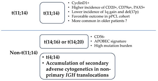 Although pPCL shares genomic abnormalities with MM, the genetic profile, including the cytogenetics, of pPCL is distinct from that of NDMM [,]. The incidence of t(11;14), t(14;16), t(14;20), del(1p), del(13q), del(17p), 1q gain, and hypodiploidy are higher in patients with pPCL than in those with NDMM [,,,,]. Except for the higher frequency of t(11;14), pPCL has similar cytogenetic features to those of high-risk NDMM (i.e., a high frequency of high-risk cytogenetics and multiple high-risk cytogenetics) []. Recently, van de Donk et al. reported that the cytogenetic profile differed between the patients aged ≤65 years and those aged >66 years among the patients with pPCL enrolled in the EMN12/HOVON-129 study []. The authors reported that the frequency of t(11;14) was lower whereas the frequencies of t(14;16) and del(17p) were higher in patients with pPCL aged ≤65 years (Table 1) []. These findings might suggest that patients are categorized into those who develop pPCL in association with t(11;14), which is more commonly observed in older individuals, and those who develop pPCL in association with high MAF/MAFB expression and/or poor prognostic secondary abnormalities, which are more commonly observed in younger individuals (Figure 2).