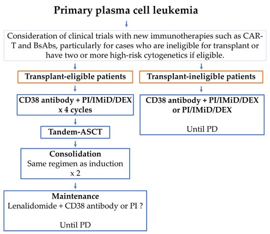 Historically, pPCL has been associated with high early mortality and extremely poor OS. Conventional MM chemotherapy in pPCL has shown a response rate of less than 50% and a 5-year OS of less than 10% []. Novel anti-MM agents—such as CD38 antibodies, proteasome inhibitors (PIs), and immunomodulatory drugs (IMiDs)—have improved response rates, the quality of response, progression-free survival (PFS), and OS in pPCL compared to conventional chemotherapy, although not to the extent seen in NDMM [,,,,]. Currently, CD38 antibody-based quadruplet regimens—including a CD38 antibody, PI, IMiD, and dexamethasone (DEX)—are recommended as the optimal frontline therapy for patients with pPCL (Figure 3) [,]. Autologous hematopoietic stem cell transplantation (ASCT), especially tandem ASCT followed by consolidation and maintenance therapy, has been shown to reduce early relapse and improve survival, and is therefore recommended for eligible patients []. There is no established post-transplant treatment regimen for CD38 antibody-based quadruple therapy; however, since treatment failure in pPCL can lead directly to death, consolidation therapy is recommended to be the same as the induction therapy that has been demonstrated to be effective []. This will help deepen the response and reduce the risk of early recurrence. Maintenance therapy will be continued for a long period of time until progression or intolerance, and will consist of a two-drug combination therapy based on lenalidomide excluding steroids [].