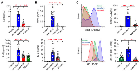 Cytokine secretion and surface marker expression in co-cultures of TCam-2 and immune cells in the presence or absence of cell–cell contact. Individually cultured cells served as controls. (A) IL-2 and IL-6 levels in T cell co-cultures (n = 4–5 for IL-2, n = 11–13 for IL-6). (B) TNFα and IL-6 levels in monocyte co-cultures (n = 15). (C) CD25 and CD163 expression on monocytes based on frequency or MFI, respectively (n = 10–12 for CD25, n = 9 for CD163). Exemplary overlay histograms (left panels) and bar diagrams showing the mean ± SEM with individual data points (right panels). Statistical analysis was performed by One-way ANOVA followed by a Tukey’s multiple comparison test (*: p < 0.05; **: p < 0.01; ***: p < 0.001; n.s.: p > 0.05).