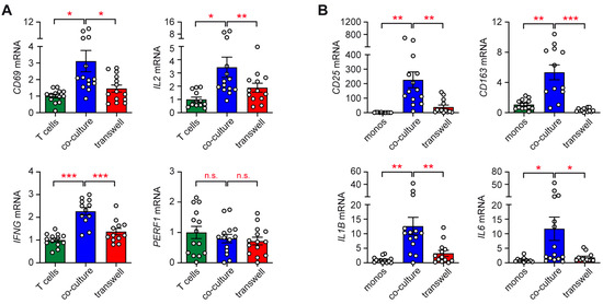 Expression of activation marker and cytokine genes in co-cultures of TCam-2 and immune cells in presence or absence of cell–cell contact. Individually cultured immune cells served as controls. (A) CD69, IL2, IFNG, and PERF1 gene expression in T cells (n = 12–15). (B) CD25, CD163, IL1B, and IL6 gene expression in monocytes (n = 11–14). Bar diagrams showing the mean ± SEM and individual data points. Relative gene expression was calculated by normalization to the housekeeping gene 18SRNA and arbitrarily set to 1 in immune cells cultured alone. Statistical analysis was performed by One-way ANOVA followed by a Tukey’s multiple comparison test (*: p < 0.05; **: p < 0.01; ***: p < 0.001; n.s.: p > 0.05).