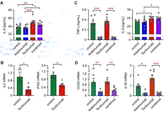 Subsequently, TCam-2 co-cultures with monocytes were treated with Adalimumab, Tocilizumab, or both antibodies combined. Adalimumab strongly reduced the TNFα levels in the cell culture supernatants, whereas Tocilizumab moderately increased the IL-6 levels, similar to in T cell co-cultures (Figure 3C). These data confirm that both antibody treatments were effective in principle. When we analyzed gene expression, it turned out that Adalimumab reduced CD25 and IL1B mRNA levels regardless of whether it was added alone or combined with Tocilizumab (Figure 3C). In contrast, Tocilizumab had no effect on monocyte gene expression, possibly due to residual IL-6 activity (Figure 3C). We suspect that the lack of detectable effects of Tocilizumab treatment on gene expression in this setup may be due to the large IL-6 concentrations in the monocyte co-cultures, which are approximately 70-fold higher than in the T cell co-cultures and thus presumably overwhelm Tocilizumab’s blocking capacity.