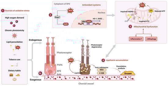 Lipofuscin accumulates in the RPE as a byproduct of light-driven vitamin A recycling in the visual cycle. This fluorescent pigment, which is primarily composed of the bisretinoid N-retinyl-N-retinylidene ethanolamine (A2E) [36], progressively builds up with age and is implicated in AMD pathogenesis (Figure 1, part 4) [37], although its precise role remains under investigation [38]. The essential role of the RPE in the phagocytosis of lipid-rich photoreceptor outer segments becomes compromised over time, leading to the detection of cytotoxic lipofuscin deposits via fundus autofluorescence imaging. A2E, a condensation product of all-trans retinal (atRAL), exacerbates oxidative stress by sensitizing RPE cells to blue light, which generates singlet oxygen and superoxide radicals that overwhelm endogenous antioxidant defenses [39]. These reactive species damage mitochondrial DNA, disrupt electron transport chain function—as evidenced by a 60% reduction in cytochrome c oxidase activity in AMD-affected RPEs [40]—and ultimately trigger apoptosis [41]. Concurrently, the lipid peroxidation of PUFAs generates toxic aldehydes such as 4-hydroxynonenal (4-HNE) and malondialdehyde (MDA). These byproducts form adducts with proteins and DNA, disrupting cellular homeostasis [42]. Notably, MDA accumulation in AMD modifies endogenous molecules, creating oxidation-specific epitopes that contribute to disease progression. The Y402 polymorphism in complement factor H (CFH), a major genetic risk factor for AMD, markedly impairs the ability of CFH to bind MDA, providing a mechanistic link between genetic susceptibility and oxidative damage [43]. In advanced AMD, these peroxidation products accumulate within drusen and the Bruch’s membrane (BrM), exacerbating local inflammation and impairing nutrient transport to photoreceptors, thereby driving degenerative changes.
