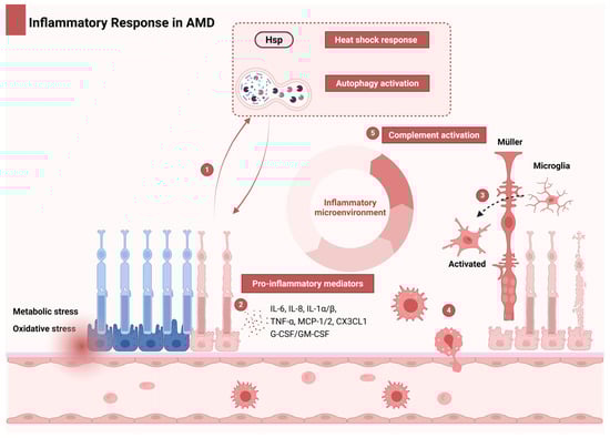 Inflammatory cascade and immune dysregulation in AMD. Under oxidative/metabolic stress, compromised retinal neurons and RPE cells initiate an inflammatory cascade. Part 1: Early adaptation: HSPs and autophagy provide transient protection. Part 2: Proinflammatory microenvironment: Chronic stress in aging retinas overwhelms protective mechanisms, inducing cellular senescence/apoptosis. Senescent cells establish a self-perpetuating microenvironment via senescence-associated proinflammatory mediators, including IL-6, IL-8, TNF-α, IL-1α/β, MCP-1/2, CX3CL1, and G-CSF/GM-CSF. Part 3: Local amplification: Proinflammatory mediators activate resident microglia, Müller cells, and RPE while recruiting choroidal macrophages. Part 4: Complement dysregulation: Local inflammation amplifies complement system activity. Part 5: Systemic engagement: Exceeding adaptive thresholds triggers systemic innate immune activation and complement amplification. This feedforward loop drives AMD progression through oxidative damage, chronic immune activation, and complement-mediated tissue injury. Abbreviations: AMD, age-related macular degeneration; G-CSF, granulocyte colony-stimulating factor; GM-CSF, granulocyte–macrophage colony-stimulating factor; HSP, heat shock protein; IL, interleukin; MCP-1/2, monocyte chemoattractant protein-1/2; RPE, retinal pigment epithelium; TNF-α, tumor necrosis factor-alpha.