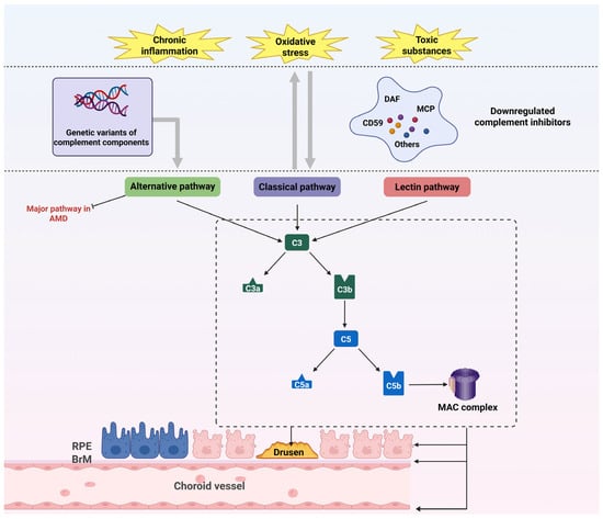 Complement system dysregulation is a cornerstone of AMD pathogenesis and is driven by chronic inflammation and innate immune hyperactivity. The alternative complement pathway dominates this process, although all three pathways (classical, lectin, alternative) contribute to host defense under normal conditions (Figure 3). In AMD, oxidative stress and visual cycle byproducts trigger RPE and choroidal cells to downregulate complement inhibitors such as decay-accelerating factor (DAF), membrane cofactor protein (MCP), and CD59, enabling pathological complement activation in host tissues [53]. Histopathological studies have confirmed this mechanism, revealing that the complement components C3 and C5 within drusen and the C5b-9 membrane attack complex (MAC) are deposited in the aged Bruch’s membrane (BrM) and choriocapillaris (CC) of AMD donors [46]. Genetic evidence further solidifies this link: genome-wide association studies (GWAS) implicate over 50 AMD-associated loci, with complement genes (CFH, CFI, CFB, C3, FB/C2) accounting for a significant proportion of disease heritability (Table 1) [54].