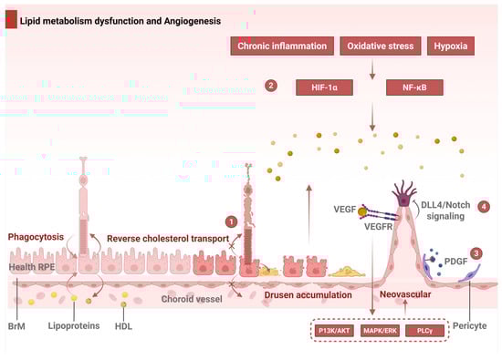 The RPE secretes cholesterol-rich lipoproteins containing apolipoproteins B (ApoB) and E (ApoE) into BrM [63], which is derived from ingested circulating lipoproteins or phagocytosed photoreceptor outer segments (Figure 4, Part 1) [64]. Under normal physiological conditions, the RPE recycles cholesterol to photoreceptors or exports it via reverse cholesterol transport mediated by ApoA-I [65], forming high-density lipoprotein (HDL) particles [66]. However, impaired reverse cholesterol transport drives the RPE to secrete ApoB100-containing lipoproteins into BrM [67], initiating lipid accumulation akin to atherosclerotic processes [24]. Soft drusen and BLinD emerge when aged BM and the choroidal endothelium fail to clear these effluxed metabolites, leading to sub-RPE deposits (Figure 4, Part 1) [64].