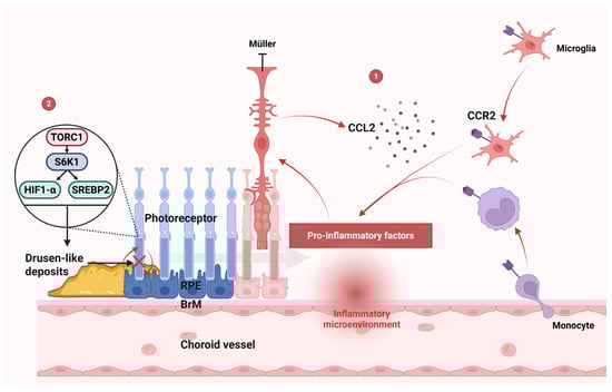 Once recruited, CCR2-positive monocytes and microglia release proinflammatory cytokines, exacerbating tissue damage and promoting the degeneration of RPE cells and photoreceptors (Figure 5, part 1) [112]. This inflammatory cascade is further amplified by the activation of Müller cells, which produce CCL2 in response to macrophage infiltration [115]. The expression of CCL2 by Müller cells could further promote the infiltration of monocytes/microglia [116]. In addition, activated Müller cells may also reduce the secretion of neurotrophic factors [115], further compromising photoreceptors’ survival.