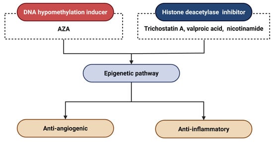 Histone deacetylase (HDAC) inhibitors represent promising therapeutic candidates for AMD, analogous to DNA hypomethylation-inducing agents, by modulating epigenetic pathways implicated in disease progression. Notably, trichostatin A, a pan-HDAC inhibitor, has been reported to suppress CNV through multiple mechanisms: it attenuates pro-angiogenic signaling, impedes CNV-associated wound healing responses, and inhibits pathological EMT in RPE cells [155]. In addition, pharmacological studies demonstrate that valproic acid [154] and nicotinamide [156] exert anti-angiogenic effects in AMD through HDAC inhibition, whereas sulforaphane confers photoprotection to RPE cells via HDAC suppression [157].