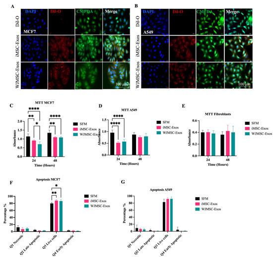 Evaluation of proliferation and apoptosis in MCF7 and A549 cells treated with iMSC-Exos or WJMSC-Exos. (A) Internalization of iMSC- and WJMSC-Exos by MCF7 and (B) A549 cancer cells. MTT assay in (C) MCF7, (D) A549 and (E) fibroblast cells treated with iMSC- and WJMSC-derived Exos. Statistical analysis of the percentage of Q1 (necrotic cells), Q2 (late apoptotic cells), Q3 (live cells), and Q4 (early apoptotic cells) in (F) MCF7 cells and (G) A549 cells. Data are represented as mean ± SD. * p ≤ 0.05, ** p ≤ 0.01, **** p ≤ 0.0001.