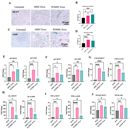 Examination of senescence-associated markers in MCF7 and A549 cells treated with exosomes. ((A) & (C)) Representative microscopic images of senescent cells (green) in MCF7 (upper left) and A549 (lower left). ((B) & (D)) Quantification of senescent cell percentages following treatment with iMSC-derived or WJMSC-derived exosomes for MCF7 cells (top right) and A549 cells (bottom right) cells. Expression levels of senescence-associated genes in MCF7 and A549 cells treated with iMSC- or WJMSC-derived Exos: (E) p53, (F) p21Cip1, (G) CXCL8, (H) IL-6, (I) TNF-α, and (J) TGF-β1. All Data are expressed as mean ± SD. Statistical significance is indicated as ns (not significant), * p ≤ 0.05, ** p ≤ 0.01, *** p ≤ 0.001 and **** p ≤ 0.0001.