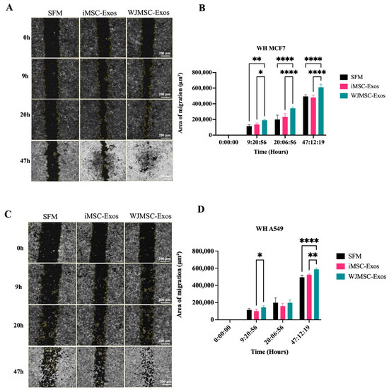 A scratch assay was performed on MCF7 and A549 cancer cells to measure the rate of wound healing at approximately 0, 9, 20, and 47 h after the scratch was made. Microscopic images of MCF7 (Figure 3A) and A549 (Figure 3C) cells were captured to assess migration. In MCF7 cells, treatment with WJMSC- Exos resulted in a significant increase in cell migration compared to both the SFM control and iMSC-Exos, with no statistically significant effect observed with iMSC-Exos (Figure 3B). In A549 cells, a similar effect of WJMSC-Exos was observed, with variations at specific time point of wound healing measurement (Figure 3D). WJMSC-Exos significantly increased migration at ~9 h compared to iMSC-Exos, and at 47 h compared to both SFM and iMSC-Exos, with the most pronounced effect seen at approximately 47 h.