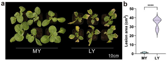 The phenotypes of MY and LY varied greatly after inoculation. (a) Phenotypic differences between MY and LY post-inoculation. (b) Statistical analysis of the lesion area. The data are shown as the means ± SDs, n = 3. Asterisks represent significant differences between two groups according to the Unpaired t test (**** p < 0.0001).