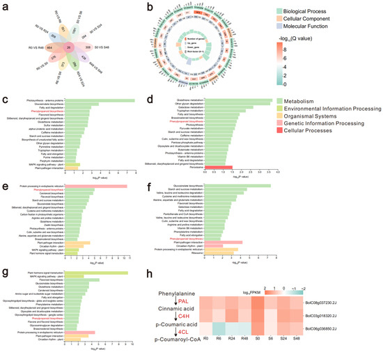 The phenylpropanoid biosynthesis pathway is differentially expressed in cabbage after inoculation. (a) Flower plot of 10 sets of differentially expressed genes. (b) shows the GO enrichment results for R0 vs. S0. (c–g) represent KEGG enrichment results for R0 vs. S0, R24 vs. S24, R0 vs. R24, S0 vs. S24, and S0 vs. S48, respectively. (h) Expression profiles of key genes in the phenylpropanoid biosynthesis pathway across multiple time points.