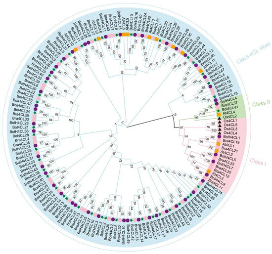 In order to determine the evolutionary relationships between Bol4CLs and 4CLs to other species, we performed multiple sequence alignment and generated a NJ phylogenetic tree for 4CLs from Arabidopsis, rice, broccoli, and Chinese cabbage (Figure 3). A gene ID renaming table can be found in Table S3. For this study, we generated a version of the phylogenetic reconstruction that incorporated the 4CL and 4CL-like amino acid sequence data from cabbage, Arabidopsis, rice, broccoli, and Chinese cabbage. In total, all 4CLs from 5 species are clustered into three classes, designated as Class 1, Class 2, and Class 4CL-likes. Class 1 contained three At4CL genes (At4CL1, At4CL2, and At4CL3) and four Os4CL genes (Os4CL1, OsAt4CL3, Os4CL4, and Os4CL5), Class 2 contained At4CL4, Os4CL5, and Bol4CL41, while Class 4CL-likes included all of the 4CL-like genes identified from Arabidopsis (At4CL5, At4CL6, At4CL7, At4CL8, At4CL9, At4CL10, At4CL11, At4CL12, and At4CL13) and mostly derived from the genes of cabbage, broccoli, and Chinese cabbage. Based on evolutionary relationships, Os4CL genes are found only in Classes 1 and 2, while Bol4CL genes are present in Classes 2 and 4CL-likes. Arabidopsis, broccoli, and Chinese cabbage are distributed across Classes 1, 2, and 4CL-likes. There is potential functional similarity among the 4CL genes within the same group; the phylogenetic tree results help predict the functions of Bol4CL genes.
