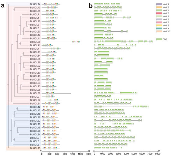 Phylogenetically alignment conserved motifs and gene structures analysis of Bol4CL genes in cabbage. (a) Different colored boxes indicate the 10 conversed protein motifs of Bol4CL genes. (b) Gene structure analysis of 43 Bol4CL genes.