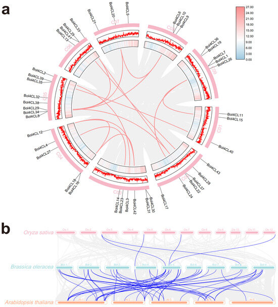 Synteny analysis of 4CL gene family in different plants. (a) Synteny Circos plot within the cabbage genome. The inner circle displays gene density, with the pink color representing higher gene density. The second circle is a linear gene density plot, with the outermost circle representing the chromosome. The red connecting lines indicate syntenic gene pairs. (b) Synteny plot between cabbage and rice, cabbage and Arabidopsis. The blue connecting lines indicate syntenic gene pairs between the two species.