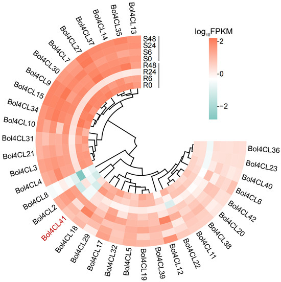 Studying the expression levels of Bol4CL genes during different inoculation stages in cabbage helps us to understand their role in plant disease resistance. The FPKM values of 43 Bol4CL genes were screened from the transcriptome data, and heat map analysis was used to visualize the expression profiles of these genes during disease resistance in cabbage (Figure 6). The results showed that a total of 35 Bol4CL genes were expressed at all time points after inoculation in both materials. The transcription levels of Bol4CL genes varied among these samples, but interestingly, the expression levels of all Bol4CL genes were significantly lower at the R24 stage than at other stages. It was speculated that Bol4CL genes negatively regulated the resistance to BR in cabbage, and that 24 h after inoculation was a critical period for the colonization and propagation of the bacteria, so that the expression of Bol4CL genes in the resistant material was greatly reduced. Genes such as Bol4CL13, Bol4CL14, and Bol4CL35 showed sustained expression and relatively high expression levels at different stages in both materials. Bol4CL41 gene expression was higher in susceptible material and lower in resistant material, exhibiting a similar expression pattern to Bol4CL2, which is in the same branch. In conclusion, these genes may play a role in negatively regulating BR resistance in cabbage, but further functional validation is needed to confirm this hypothesis.
