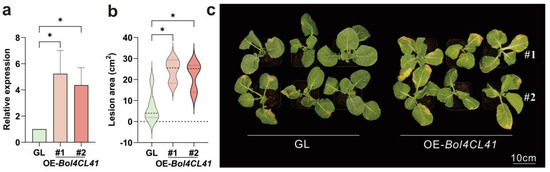 To elucidate the biological functions of Bol4CL41 proteins in cabbage, we generated transgenic plants overexpressing Bol4CL41. Through continuous self-fertilization, homozygous T2 generation plants were ultimately obtained and confirmed the resulting altered gene expression by qRT-PCR (Figure 7a). Two independent transgenic lines exhibiting high levels of Bol4CL41 were selected for further inoculation tests. The seedling phenotype showed that the transgenic lines showed a significantly increased susceptibility to BR compared to the wild type (GL) after inoculation (Figure 7b,c). These results demonstrate that Bol4CL41 negatively regulates BR resistance in cabbage.