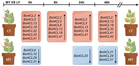 Increasing studies have shown that 4CLs play critical roles in the biotic stress responses of plants [35,36]. Analysis of gene expression patterns in plants under biotic stress can provide valuable insights into gene function. Differentially expressed genes may be candidate genes involved in the plant’s stress response. We constructed a clustered heatmap to analyze the expression profiles of 43 Bol4CL genes in MY and LY at different time points post-inoculation with Xcc. The results revealed that Bol4CL41 and Bol4CL2 exhibited higher expression levels in the susceptible material and lower levels in the resistant material, suggesting that Bol4CL2 and Bol4CL41 may play a role in negatively regulating BR resistance in cabbage. Furthermore, Bol4CL41 was identified as a differentially expressed gene across all 10 groups in the transcriptome analysis, making it a key gene for further investigation.