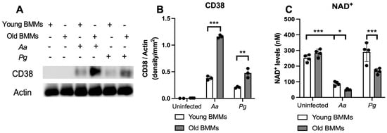 First, we compared CD38 protein levels in young vs. old murine BMMs with or without infection with the oral pathogens Aa or Pg. As shown in Figure 1A,B, CD38 protein levels were undetectable in uninfected young and old murine BMMs. In contrast, 24 h after Aa or Pg infection, old murine BMMs exhibited significantly higher CD38 protein levels compared with young controls (** p < 0.01, *** p < 0.001). Compared with young controls, old murine BMMs displayed an average of 3.1-fold and 2.3-fold of CD38 protein levels after Aa or Pg infection, respectively. Accordingly, in uninfected young or old murine BMMs, the NAD+ levels were similar between young and old murine BMMs. In contrast, in old murine BMMs infected with Aa or Pg for 24 h, the NAD+ levels were significantly lower in old murine BMMs than young controls (* p < 0.05, *** p < 0.001). Compared with young controls, the NAD+ levels were reduced by about 43.6% and 42.3% in old murine BMMs infected with Aa or Pg, respectively. These results support that old murine BMMs expressed abnormally higher CD38 protein levels and lower NAD+ levels after infection with the oral pathogens Aa or Pg compared with young controls.