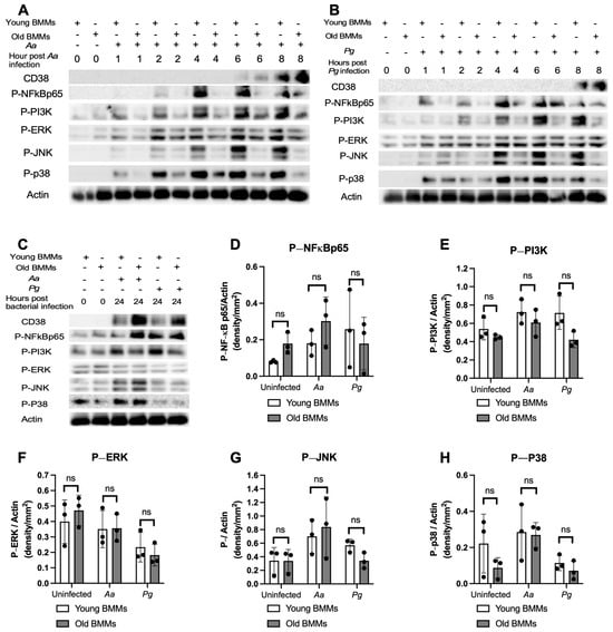 Old murine BMMs displayed delayed immune responses to infection with either the oral pathogens Aggregatibacter actinomycetemcomitans (Aa) or Porphyromonas gingivalis (Pg) compared to young controls. Young and old murine BMMs were either uninfected or infected with an oral bacterial pathogen Aa or Pg for 1 to 24 h. (A–C) Protein levels of CD38, p-NFκBp65, p-PI3K, p-ERK, p-JNK, p-p38, and pan-actin in cell lysate were determined by Western Blot. Protein densitometry of p-NFκBp65 (D), p-PI3K (E), p-ERK (F), p-JNK (G), and p-p38 (H) 24 h after bacterial infection were evaluated. Statistics were analyzed by ordinary one-way ANOVA with Tukey’s multiple comparisons test. (n = 3, ns: no significance).