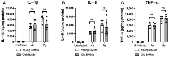 Old murine BMMs displayed similar IL-1β, IL-6, and TNF-α cytokine levels 24 h after infection with either the oral pathogens Aggregatibacter actinomycetemcomitans (Aa) or Porphyromonas gingivalis (Pg) compared to young controls. Young and old murine BMMs were either uninfected or infected with an oral bacterial pathogen Aa or Pg (MOI 20) for 24 h. Cytokine levels of IL-1β (A), IL-6 (B), and TNF-α (C) were quantified by ELISA and calibrated by protein expression in cell lysate. Statistics were analyzed by ordinary one-way ANOVA with Tukey’s multiple comparisons test. (n = 5, ns: no significance).