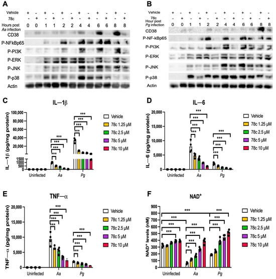 Previously, our study [] demonstrated that the inhibition of CD38 by 78c reduced CD38 and attenuated the activation of NF-κB, PI3K, and MAPKs induced by the oral pathogens Aa or Pg in murine BMMs derived from TALLYHO/JngJ mice (type 2 diabetic mice). We hypothesized that treatment with 78c would also suppress CD38 and the activation of NF-κB, PI3K, and MAPKs induced by the oral pathogens Aa or Pg in old murine BMMs. As shown in Figure 4A,B, treatment with 78c (10 μM) reduced CD38, p-NF-κBp65, p-PI3K, p-ERK, p-JNK, and p-p38 MAPK induced by Aa or Pg. Accordingly, we observed reductions in IL-1β, IL-6, and TNF-α pro-inflammatory cytokines in cells treated with 78c compared with the controls. Treatment with 78c (1.25 μM, 2.5 μM, 5 μM, and 10 μM) in old murine BMMs reduced IL-1β by 50.1%, 63.9%, 88.7%, and 96.5%, respectively, as induced by Aa, and attenuated IL-1β by 73.7%, 87.3%, 89.6%, and 95.6%, respectively, as induced by Pg (Figure 4C). Treatment with 78c (1.25 μM, 2.5 μM, 5 μM, and 10 μM) also reduced IL-6 by 40.6%, 53.2%, 70.9%, and 88.1%, respectively, as induced by Aa, and attenuated IL-6 by 35.2%, 68.4%, 82.2%, and 90.4%, respectively, as induced by Pg (Figure 4D). Additionally, treatment with 78c (1.25 μM, 2.5 μM, 5 μM, and 10 μM) reduced TNF-α by 36.7%, 44.3%, 65.7%, and 75.4%, respectively, as induced by Aa, and attenuated TNF-α by 21.4%, 36.8%, 47.1%, and 64.1%, respectively, as induced by Pg (Figure 4E). In uninfected old murine BMMs, treatment with 78c (5 μM and 10 μM) enhanced NAD+ by 1.2-fold and 1.3-fold, respectively (Figure 4F). The NAD+ levels declined about 82.8% in cells treated with vehicle and infected with Aa and decreased about 42.9% in cells treated with vehicle and infected with Pg as compared with the NAD+ levels in cells treated with vehicle without bacterial infection (Figure 4F). Treatment with 78c (1.25 μM, 2.5 μM, 5 μM, and 10 μM) enhanced NAD+ by 1.9-fold, 2.7-fold, 4.3-fold, and 6.6-fold, respectively, in old murine BMMs infected with Aa and enhanced NAD+ by 1.3-fold, 2.1-fold, 2.4-fold, and 3.0-fold, respectively, in old murine BMMs infected with Pg (Figure 4F). These data support that the inhibition of CD38 by 78c suppressed CD38 and prevented the decline of NAD+ induced by oral pathogens. Additionally, the inhibition of CD38 by 78c suppressed the activation of NF-κB, PI3K, and MAPKs as induced by the oral pathogens Aa or Pg, and subsequently attenuated IL-1β, IL-6, and TNF-α pro-inflammatory cytokines as induced by oral pathogens.