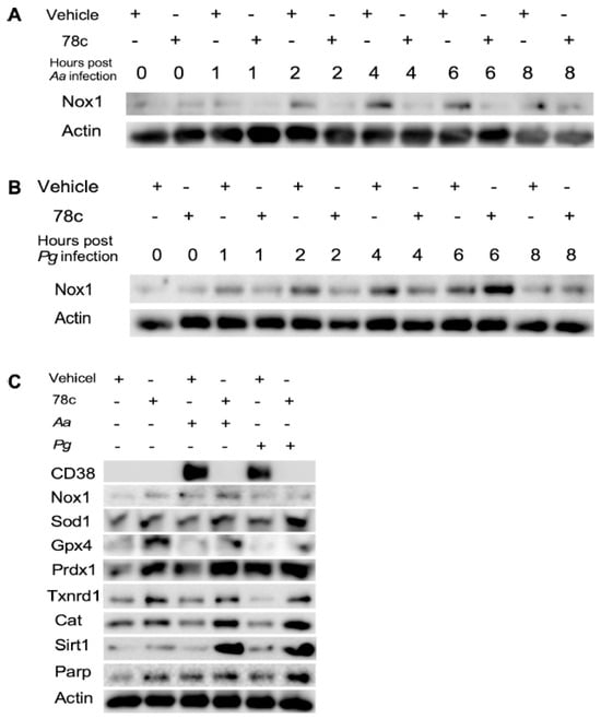 Since excessive ROS causes oxidative stress, contributing to mitochondrial dysfunction in aging [], and NADP+/NADPH serve as coenzymes in the anti-oxidative response to maintain cellular redox homeostasis [,], we hypothesized that the inhibition of CD38 by 78c in old murine BMMs could increase NAD+ and subsequently reduce oxidative stress induced by oral pathogens. As shown in Figure 5A, treatment with 78c (10 μM) for 24 h significantly reduced ROS in old murine BMMs either with or without infection of Aa (* p < 0.05) compared with vehicle controls. Treatment with 78c (1.25 to 10 μM) for 24 h also significantly reduced ROS in old murine BMMs infected with Pg (* p < 0.05, ** p < 0.01, *** p < 0.01). To determine how 78c regulates oxidative response and affects aging-associated immune responses in old murine BMMs, we quantified the mRNA levels of CD38, Nox1, anti-oxidative enzymes (Sod1, Gpx4, Prdx1, Txnrd1, and Cat), and NAD+ consuming enzymes (Sirt1 and Parp1) in old murine BMMs that were either left uninfected or were infected with Aa or Pg for 8 h. Treatment with 78c (5 and 10 μM) reduced CD38 mRNA levels by 44.5% and 61.2% as induced by Aa, respectively, and reduced CD38 mRNA levels by 28.5% and 63.2% as induced by Pg, respectively (Figure 5B). Treatment with 78c dose-dependently reduced Nox1 as induced by Aa or Pg compared with the controls (Figure 5C). Additionally, treatment with 78c dose-dependently enhanced anti-oxidant enzyme (Sod1, Gpx4, Prdx1, Txnrd1, and Cat) mRNA levels in old murine BMMs (Figure 5D–H). Furthermore, treatment with 78c does-dependently enhanced two NAD+ consuming enzyme (Sirt1 and Parp1) mRNA levels in old murine BMMs either uninfected or infected with Aa or Pg compared with controls (Figure 5I,J). Western blot protein assay also showed that treatment with 78c (10 μM) in old murine BMMs suppressed Nox1 protein levels at 1, 2, 4, and 6 h after Aa infection compared with the controls (Figure 6A), and reduced Nox1 protein expressions at 1, 2, and 4 h after Pg infection compared with the controls (Figure 6B). After treatment with 78 c (10 μM) for 24 h, CD38 protein levels were reduced in old murine BMMs infected with Aa or Pg compared with the controls (Figure 6C). At 24 h after treatment, Nox1 protein levels were similar between 78c-treated cells and vehicle-treated cells. We observed enhanced protein levels of anti-oxidant enzymes (Sod1, Gpx4, Prdx1, Txnrd1, and Cat) in uninfected old murine BMMs or Aa- or Pg-infected BMMs compared with the controls (Figure 6C). These results support that 78c attenuated oxidative stress by inhibiting Nox1 mRNA and protein expressions, while enhancing anti-oxidant enzyme mRNA and protein expressions. Additionally, we also observed enhanced NAD+ consuming enzymes (Sirt1 and Parp) proteins in 78c (10 μM)-treated uninfected old murine BMMs or Aa- or Pg-infected BMMs compared with the controls (Figure 6C).