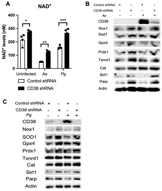 Knockdown of CD38 by a CD38 shRNA increased NAD+ and enhanced the protein levels of Nox1, Sod1, Gpx4, Prdx1, Txnrd1, Cat, Sirt1, and Parp1 in old murine BMMs either uninfected or infected with the oral pathogens Aggregatibacter actinomycetemcomitans (Aa) or Porphyromonas gingivalis (Pg). Old murine BMMs were treated with a CD38 shRNA or a control shRNA for 72 h. Then, the cells were either uninfected or infected with the oral pathogens Aa or Pg for 24 h for the NAD+ assay (A) or for 6 h for Western blot protein assay (B,C). CD38, Nox1, Sod1, Gpx4, Prdx1, Txnrd1, Cat, Sirt1, Parp, and control pan-actin protein expression were evaluated by Western blot. (* p < 0.05, ** p < 0.01, *** p < 0.001).