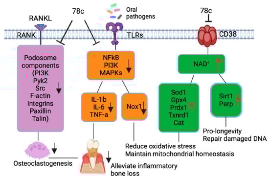 Roles of CD38 inhibitor (78c) in treating aging-associated with periodontitis. Treatment with 78c suppressed podosome component (PI3K, Pyk2, Src, F-actin, integrins, paxillin, and talin) expressions, subsequently inhibiting osteoclastogenesis and bone resorption []. Treatment with 78c inhibited NF-κB, PI3K, and MAPK protein kinases induced by oral bacterial pathogens, suppressing IL-1β, IL-6, TNF-α, and inflammation. Treatment with 78c reduced Nox1 expression, increased NAD+, and enhanced anti-oxidant enzyme (Sod1, Gpx4, Prdx1, Txnrd1, and Cat) expression and subsequently reduce oxidative stress and maintain mitochondrial homeostasis. Treatment with 78c increased NAD+ consuming enzyme (Sirt1 and Parp) expressions, which subsequently promote longevity and the repair of DNA damage.