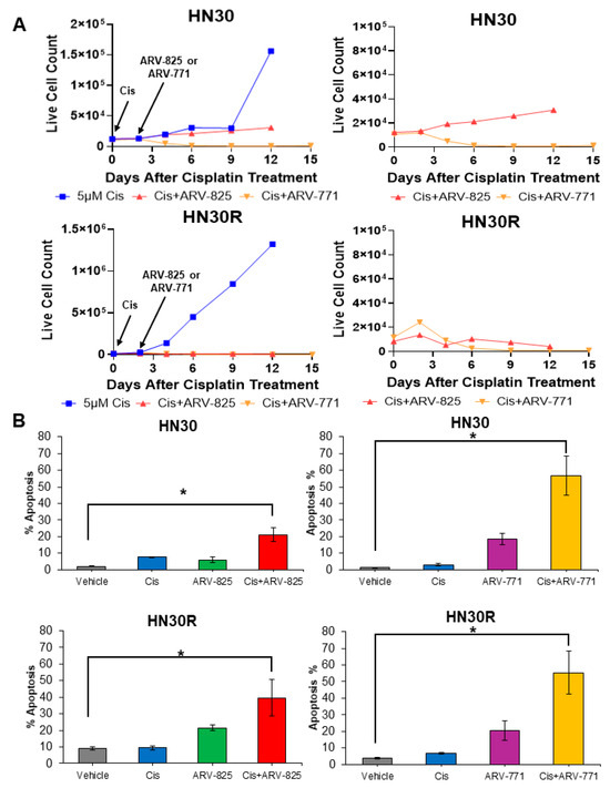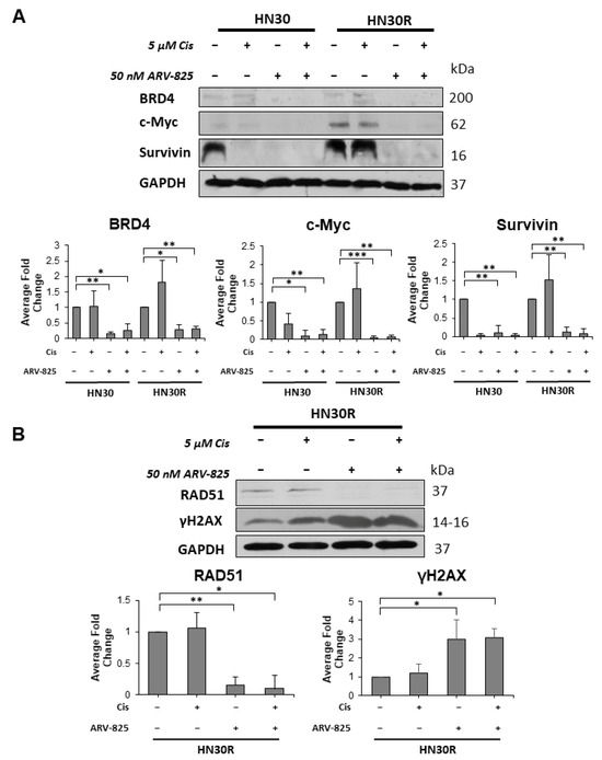2.6. Suppression of BRD4 Promotes a Reduction in Target Proteins and the Induction of DNA Damage in HN30R Cells Treated with Cisplatin and ARV-825
