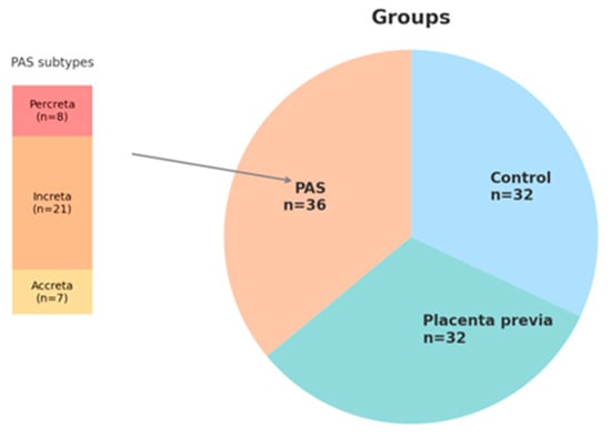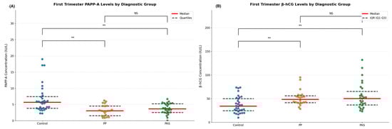 Belousova, V.; Ignatko, I.; Bogomazova, I.; Zarova, E.; Pesegova, S.; Samusevich, A.; Kardanova, M.; Skorobogatova, O.; Kuzmina, T.; Kireeva, N.; et al. Combined First-Trimester PAPP-A and Free β-hCG Levels for the Early Diagnosis of Placenta Accreta Spectrum and Placenta Previa: A Case-Control Study. Int. J. Mol. Sci. 2025, 26, 6187. https://doi.org/10.3390/ijms26136187