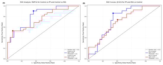 | PAPP-A (IU/L) | Control vs. PAS | 0.75 (0.62–0.86) | 5.59 IU/L | 92.6% | 53.1% |