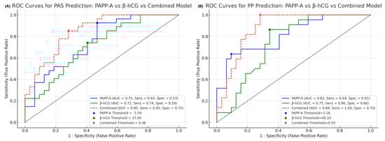 APA StyleBelousova, V., Ignatko, I., Bogomazova, I., Zarova, E., Pesegova, S., Samusevich, A., Kardanova, M., Skorobogatova, O., Kuzmina, T., Kireeva, N., & Maltseva, A. (2025). Combined First-Trimester PAPP-A and Free β-hCG Levels for the Early Diagnosis of Placenta Accreta Spectrum and Placenta Previa: A Case-Control Study. International Journal of Molecular Sciences, 26(13), 6187. https://doi.org/10.3390/ijms26136187