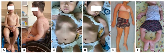 External clinical features of patients with osteogenesis imperfecta type VI: (A,B) Patient 1; (C,D) Patient 2; (E) Patient 3; (F) Patient 4.