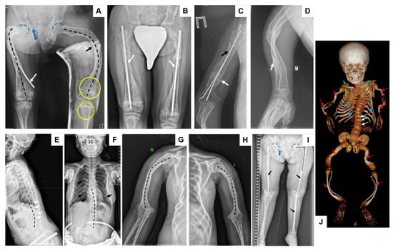 Radiographic findings in patients with osteogenesis imperfecta type VI:. (A) Anteroposterior radiograph of lower limbs of proband 1: multiplanar (varus-antecurvatum) deformity of both femora secondary to pathological fractures (black broken lines), treated surgically with intramedullary nail on the right side (white arrow) and plaster on the left side; Looser zone (stress fracture) of the midshaft of the left femur (black arrow); deep acetabulae (blue broken lines), deformed pelvic ring (vertically elongated obturator foramina (blue arrow), multiple “zebra-lines” in the metaphyseal regions after bisphosphonates treatment (yellow circles). (B) Anteroposterior radiograph of lower limbs of proband 1 after surgical correction with telescopic intramedullary nails (white arrows): restored axial alignment of the femoral bones. (C) Radiograph of the right humerus of proband 1: pathological fracture, treated surgically with intramedullary nails (black arrow), delayed union with formation of stiff pseudoarthrosis (white arrow). (D) Radiograph of the right forearm of proband 1: multiplanar (S-shaped) deformity of radius and ulna, stiff pseudoarthrosis of ulnar midshaft (white arrow); multiple “zebra-lines” in the metaphyseal regions after bisphosphonates treatment. (E) Lateral radiograph of thoracolumbar spine of proband 3: mild pseudo-butterfly deformity of lower thoracic and upper lumbar vertebral bodies (white arrow), thoracolumbar kyphosis (black broken line). (F) Anteroposterior radiograph of chest and thoracolumbar spine of proband 3: mild scoliosis (black broken line), bell-shaped thorax, thin, vertically oriented ribs, multiple healed rib fractures (black arrows). (G,H) Anteroposterior radiograph of the humerus bones of proband 3: varus deformity (black broken lines). (I) Anteroposterior radiograph of lower limbs of proband 3 after surgical correction with telescopic intramedullary nails (black arrows): improved axial alignment of the bones, coxa vara on the left side with delayed union (black broken lines), protrusio acetabulae (blue broken lines), deformed pelvic ring with vertically elongated obturator foramina (blue arrow). (J) 3D reconstruction of the whole body CT of proband 4: multilevel, multiplanar deformities of the long tubular bones (red arrows), mild scoliosis, bell-shaped thorax, thin, vertically oriented ribs, multiple healed rib fractures, deformed pelvic ring with vertically elongated obturator foramina (yellow arrows), pseudo-butterfly deformity of lower thoracic and upper lumbar vertebral bodies (white arrows), S-shaped deformity of the clavicles (green arrows).