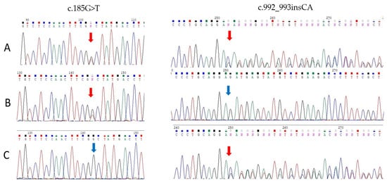 Sanger sequencing chromatograms of PCR products. Arrows indicate the positions of the identified mutations: missense (c.185G>T) and insertion (c.992_993insCA), in the proband (A), mother (B), and father (C).