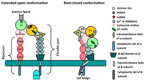 Structures of integrins’ α and β subunits. α-I—inserted domain of α subunit; β-I—inserted domain of β subunit; Hyb—hybrid domain; PSI—plexin–semaphorin–integrin; EGF—epidermal growth factor-like domain; Thigh—thigh domain of α subunit; Calf-1 and-2—Calf-1 and -2 domains of α subunit; Intrinsic Glu—intrinsic glutamic acid molecule; MIDAS—metal ion-dependent adhesion site; ADMIDAS—adjacent to MIDAS site; SyMBS—synergistic metal ion-binding site.
