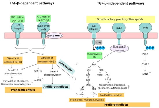 Transforming growth factor-β1 (TGF-β1) is a major contributor to the pathogenesis of fibrosis. The activation of TGF-β from its latent form requires a number of factors, in particular, the involvement of integrins. TGF-β is secreted in the form of inactive complexes with latency-associated peptides (LAPs). The activation of latent TFG-β1 and TFG-β3 isoforms occurs through two major pathways (Figure 2). The first pathway involves the recognition by αv integrins of the RGD motif as part of the LAPs. This recognition triggers the αvβ6 integrin to change the conformation of TFG-β by the mechanical force of the cell actin cytoskeleton, releasing TFG-β from its latent complex with LAPs. The second pathway of TGF-β activation occurs through the proteolytic degradation of its latent complex by matrix metalloproteinases (MMP-2 and MMP-9), although this process also requires the involvement of αv integrins. The induction of LAP conformational changes and sequestering the proteases in close proximity to LAPs in the latent complex of TGF-β1 occurs when αvβ6 and αvβ3 integrins bind to TGF-β1 and MMP simultaneously. The activation of TGF-β1 by αvβ8 integrins takes place only in a protease-dependent manner because the β8 subunit has a shortened cytoplasmic tail that is unable to bind to cytoskeletal components. Conversely, αvβ1 integrins directly bind to the LAP fragment of TGF-β1 and facilitate its activation []. TGF-β1, in turn, regulates multiple processes, including cell proliferation, angiogenesis, epithelial–mesenchymal transition, and immune suppression, all of which promote tissue regeneration. However, if left unregulated, these processes can lead to fibrosis and carcinogenesis [].