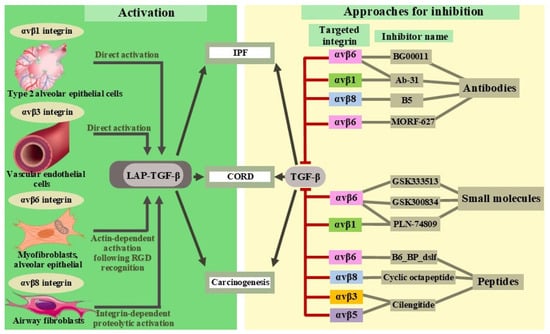 An overview of the various activities of integrins and their potential inhibitors. TGF-β—transforming growth factor-β; LAP-TGF-β—latency-associated peptides in complex with TGF-β; IPF—idiopathic pulmonary fibrosis; CORD—chronic obstructive pulmonary disease; BG00011, Ab-31, B5, MORF-627, B6_Bp_dslf, GSK3335103, GSK3008348, PLN-74809, Cyclic octapeptide, Cilengitide—potential inhibitors of integrins, which are in different stages of clinical trials.