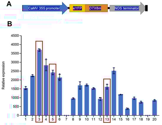 The G311E-mutated DTX6 allele, DTX6m, was cloned into the pCAMBIA-N-eYFP vector under the promoter of CaMV 35S and transformed into the rice cultivar ZH11 (Figure 1A), considering that ZH11 is widely used in rice research and its genome has been fully sequenced. Screening of T0 transgenic plants identified 20 independent lines harboring the DTX6m transgene, which were designated OE1 to OE20. Quantitative RT-PCR analysis revealed substantial variation in DTX6m expression level across these lines (Figure 1B), with the majority exhibiting significant transgene expression. T-DNA insertion at different genomic loci may result in differential transgene expression, as the genomic context of the insertion site can influence transgene activity. Moreover, insertional events may disrupt endogenous gene function during transgene expression. To evaluate the correlation between expression levels and herbicide resistance and mitigate potential impacts of endogenous gene disruption, three representative lines were chosen for phenotypic characterization: OE-3 (highest level), OE-5 (intermediate level), and OE-13 (relatively low level).