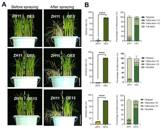 Paraquat resistance phenotypes of DTX6m-overexpression lines. (A) Growth conditions of plants before and after spraying with paraquat. ZH11 and three DTX6m-overexpression lines were grown in soil for one month and then sprayed with 0.5 g/L paraquat. Plants were photographed 10 days after spraying. (B) The survival rate and wilted leaves were documented. Data represent means ± SD of three biological replicates. Each replicate includes 10 rice plants. One-way ANOVA was performed to analyze the significance of difference between ZH11 and DTXm-overexpression lines. **** p ≤ 0.0001.